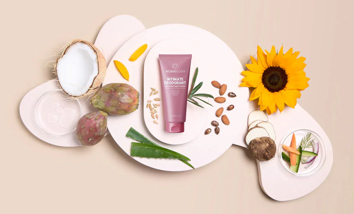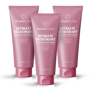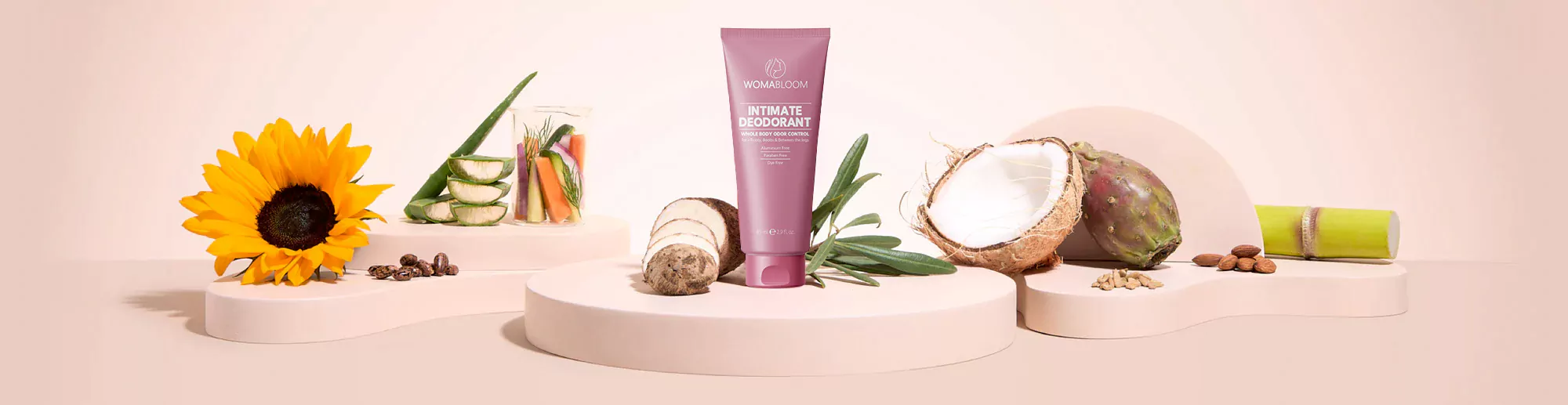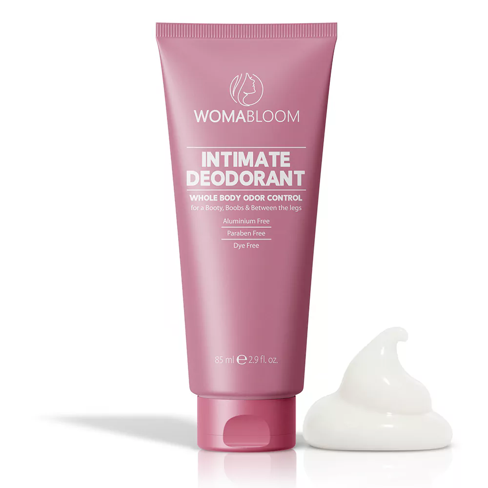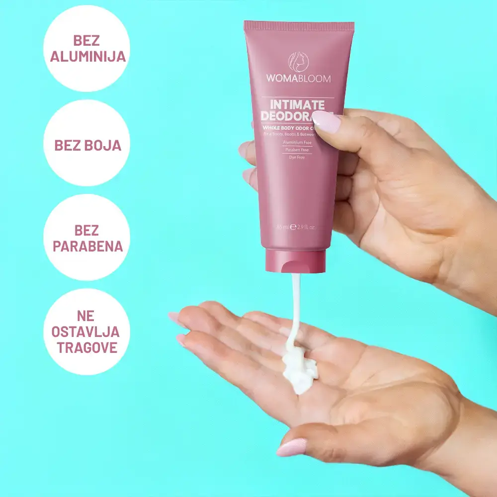 Womabloom intimni dezodorans je kremasti dezodorans namijenjen za vanjsku primjenu na pazusima, grudima, stražnjici, između nogu i bilo gdje drugdje gdje je potrebna kontrola mirisa i vlažnosti.
