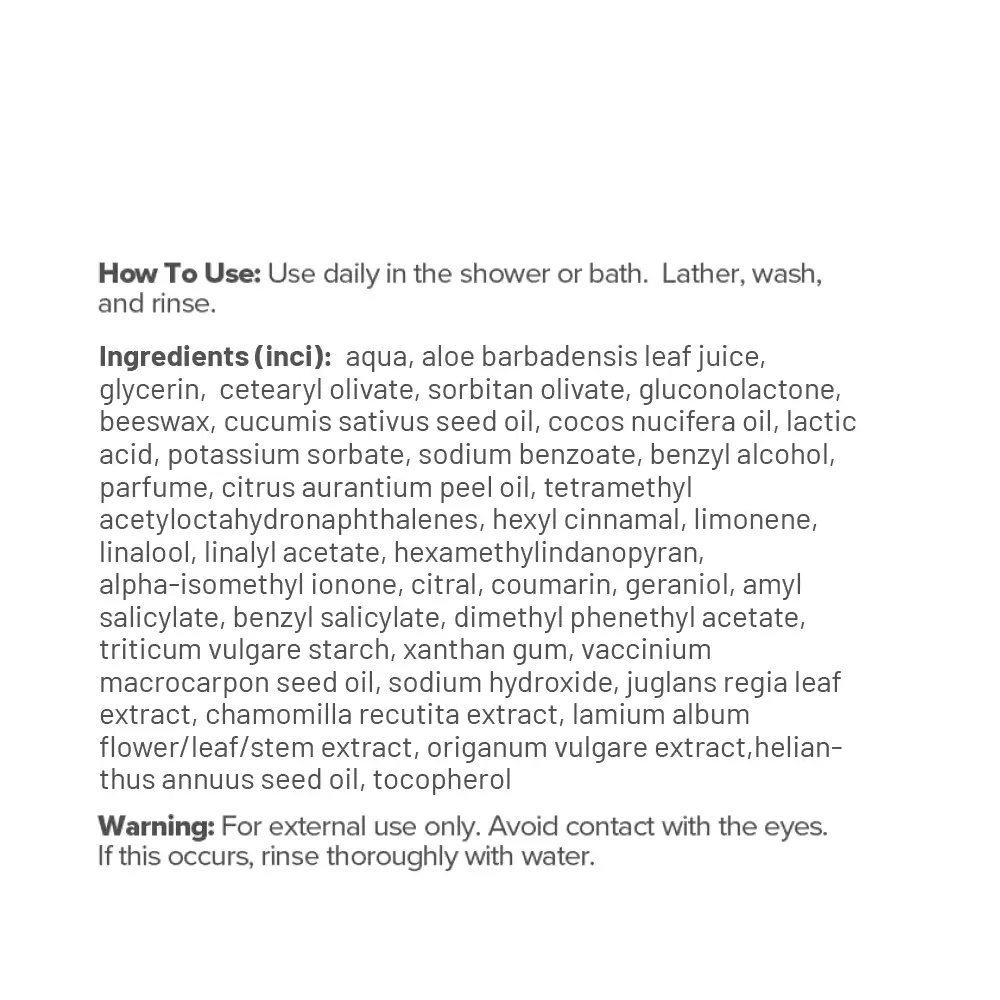 Sastojci: voda, PEG-120 metil glukoza dioleat, gliceril stearat, sok lista aloe barbadensis, glicerin, natrijev lauroil sarkozinat, natrijev kokoil izetionat, PEG-40 hidrogenirano ricinusovo ulje, kalijev sorbat, natrijev benzoat, benzilni alkohol, mliječna kiselina, ekstrakt nevena (Calendula Officinalis), ekstrakt lista kraljevskog oraha (Juglans Regia), ekstrakt kamilice (Chamomilla Recutita), ekstrakt cvijeta/lista/stabljike albuma (Lamium Album), ekstrakt urtica dioica (Urtica Dioica), natrijev hidroksid, ulje lista eukaliptusa (Eucalyptus Globulus), limonen, ferment limosilaktobacilusa (Limosilactobacillus), inulin, tokoferol, ulje sjemenki suncokreta (Helianthus Annuus), ulje lavandule (Lavandula Angustifolia), linalol, ulje lista čajevca (Melaleuca Alternifolia), natrijev izetionat.