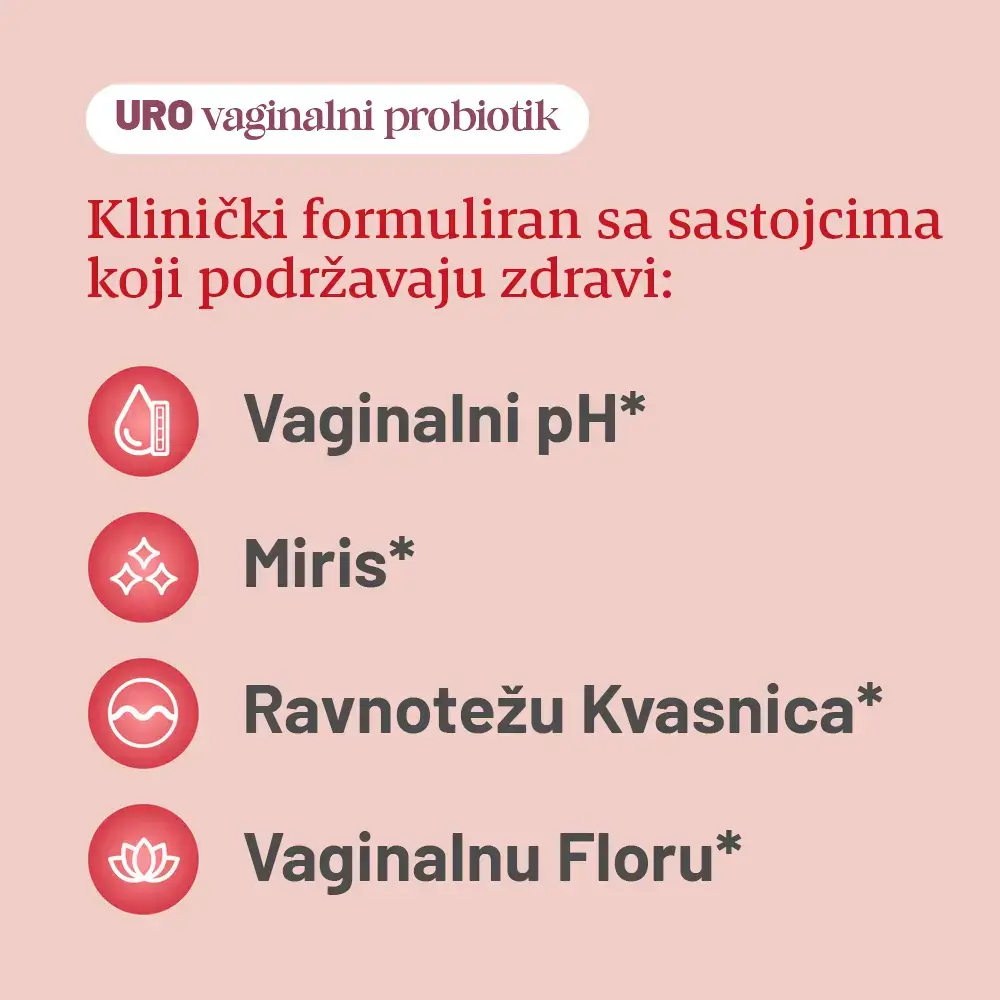 URO⁺ Vaginal Probiotic je prirodni, patentirani sinbiotički dodatak prehrani za vaginalno zdravlje (što znači da sadrži i prebiotike i probiotike) formuliran za podršku zdravom pH-u vagine, mirisu, ravnoteži gljivica i flori.